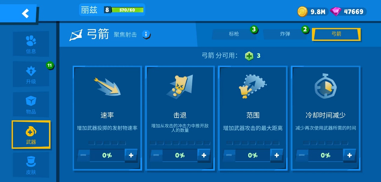 弓箭属于远程冷兵器,加分属性同标枪,也是击退、范围、冷却时间减少和速率这四种培养方向。
