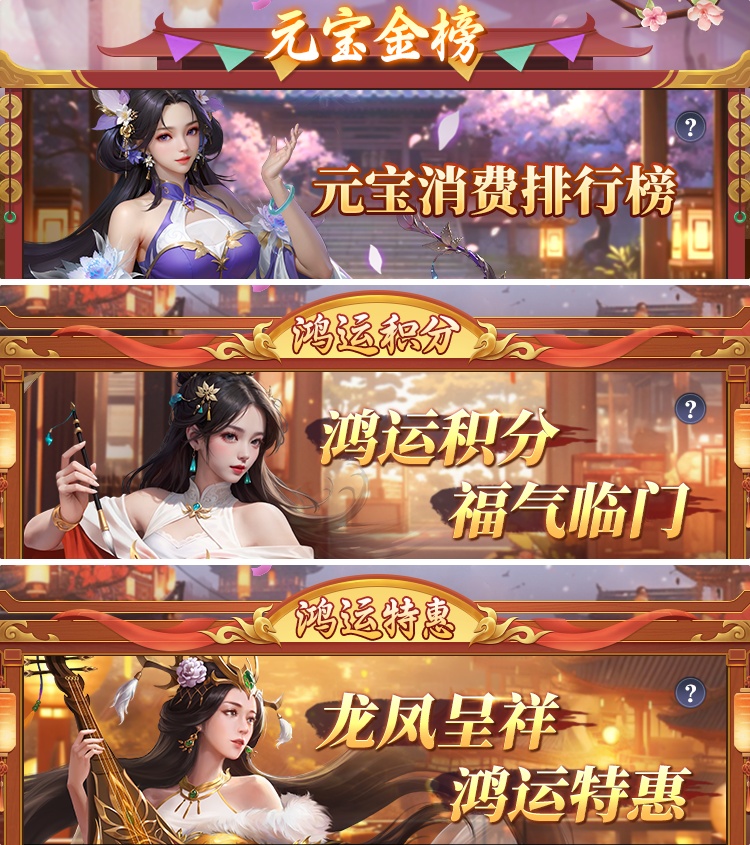 2) 元宝金榜开启,消费一定元宝数量开启金榜排名,可获得排名对应奖励,内含豪华礼包以及大量元宝回馈;