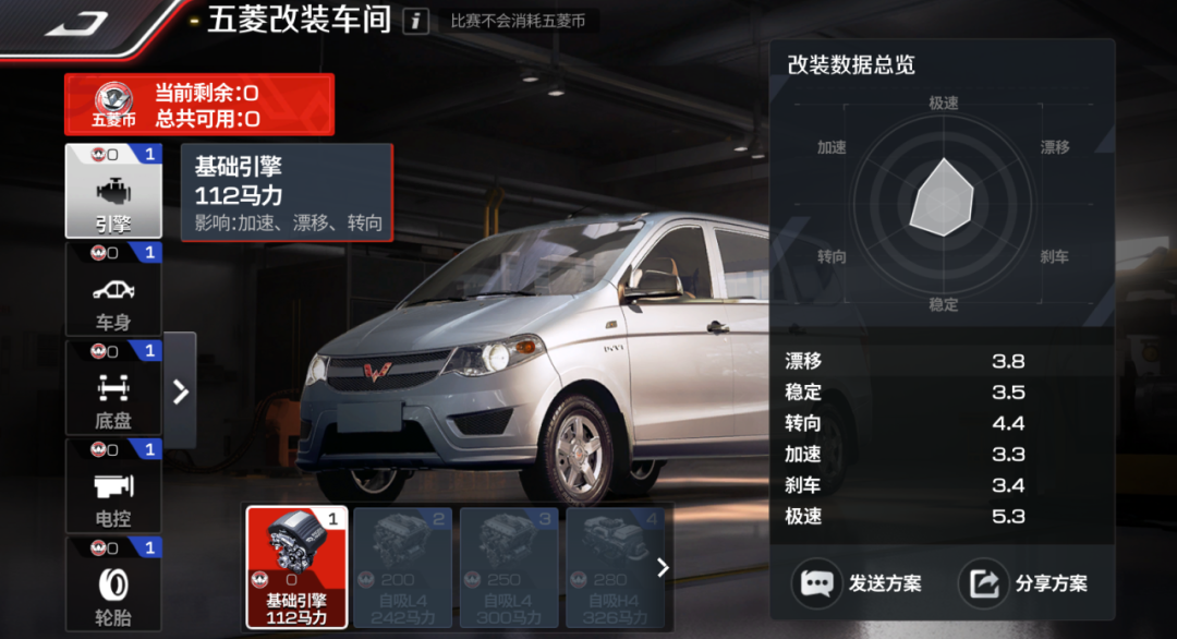 你可以合理分配你获取的五菱币,对五菱宏光的引擎、轮胎、电控、底盘和车身进行改装。这五个改装件会不同程度影响到车辆的【极速】、【加速】、【转向】【刹车】、【漂移】、【稳定】要记得改装向来是追求均衡、适合多尝试,你一定会找到属于自己的最强车神方案。