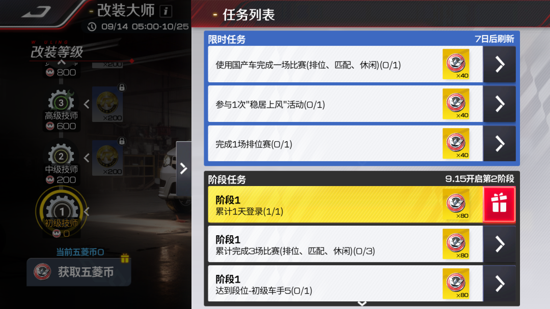 完成限时任务和阶段任务,可获得相应的五菱币,当五菱币收集到达一定阶段,可解锁对应的改装称号,并获得金币、改装材料等奖励。