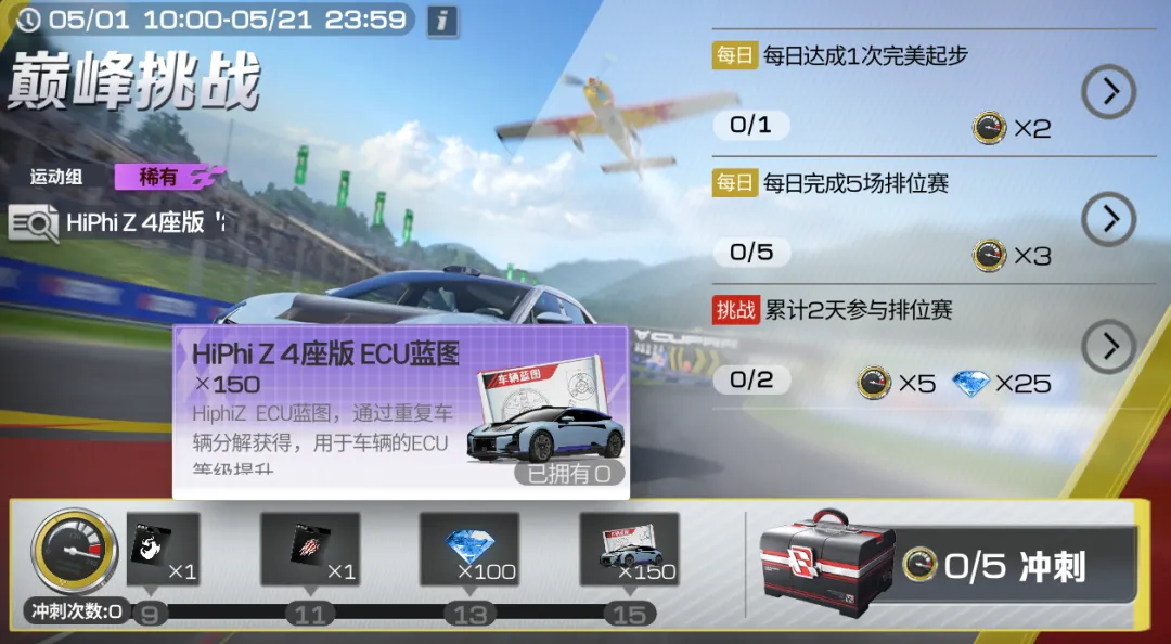 巅峰挑战完成每日任务和挑战任务,冲刺次数达15次即可再获得4台高合HiPhi Z,轻松满阶巅峰称王!