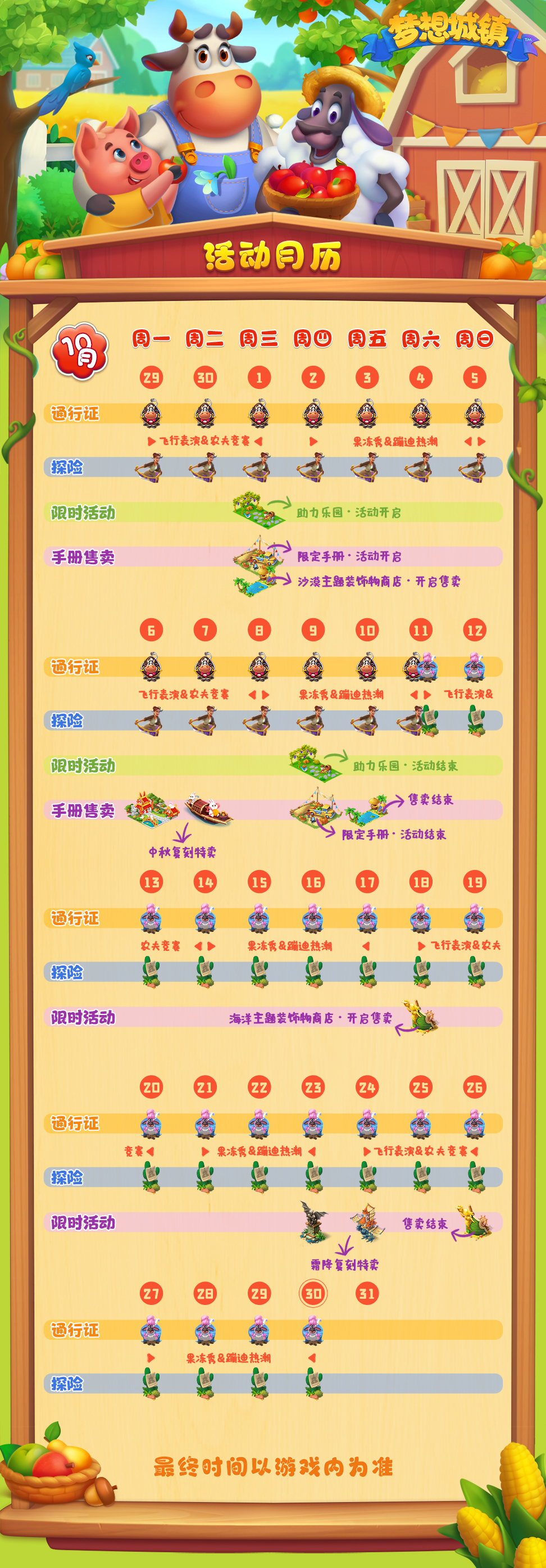 【梦想城镇】1260版本将于9月22日上午10点更新版本,已为大家标注了游戏内10月活动时间,具体请以游戏内实际活动时间为准喔;