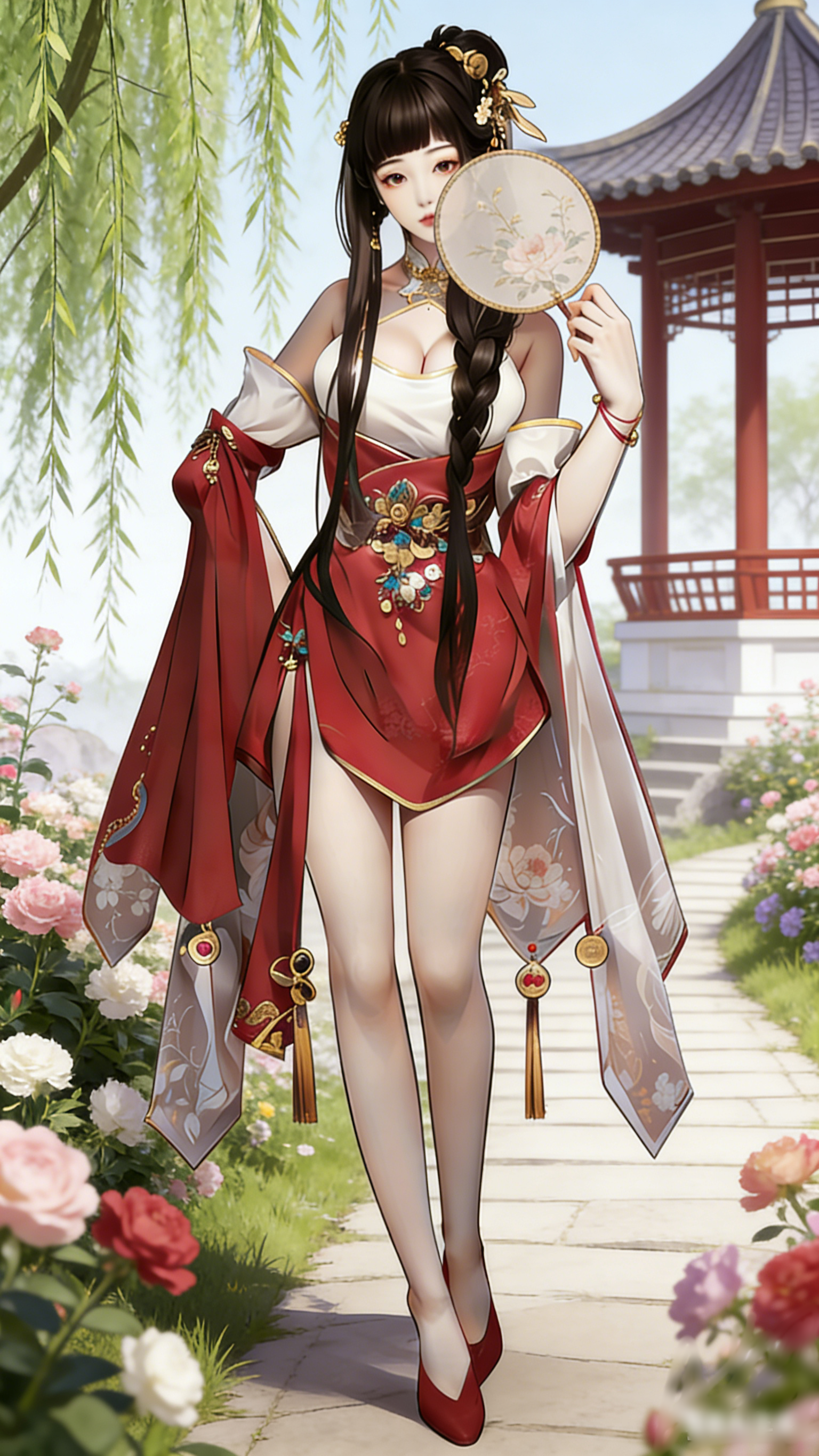 她有着乌黑如瀑的长发,常以精致的金饰挽起,几缕碎发垂落颊边,衬得眉眼愈发温婉。一身红白相间的襦裙,剪裁利落又不失灵动,腰间的金玉腰饰随着步履轻晃,既显出身世不俗,又带着几分少女的娇俏。她的眼神清澈,却又藏着一丝不易察觉的疏离,仿佛在时光里沉淀了许多心事。
