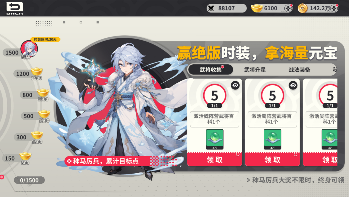 玩家获得、升星、飞升武将可以完成任务获得进度点数,进度点数达到指定值可以获得绝版时装