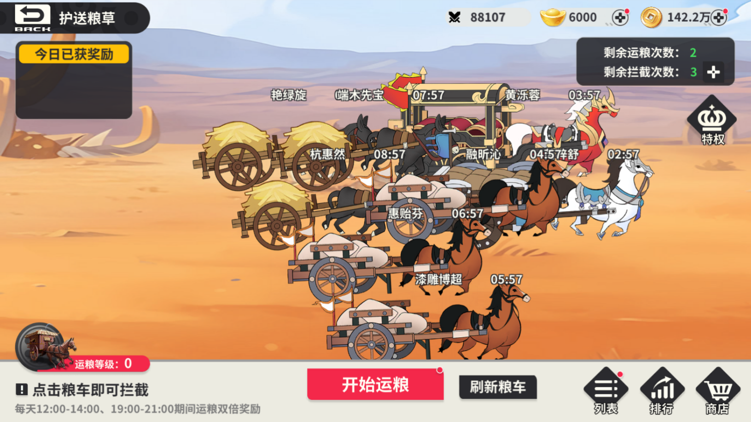 1.1 护送粮草玩家每日可以参与3次运粮和5次拦截。每次运送可以消耗元宝提升粮草车的品质,从而获得更好的奖励,同时每天中午12点-13点,20点到21点奖励双倍。