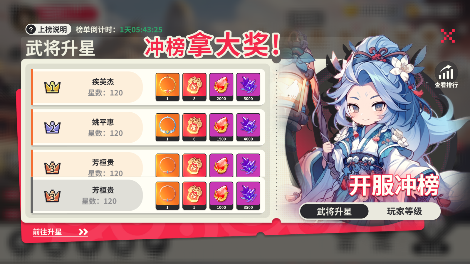 该榜单为武将升星排行,选取星级最高的6个武将的总星级来进行排名,排行榜没10分钟刷新一次,主公清多多留意自己的排名哦!排名相同的情况下,越早达到上榜的玩家排名越靠前,榜单结束时进行结算,用过邮件发放奖励。