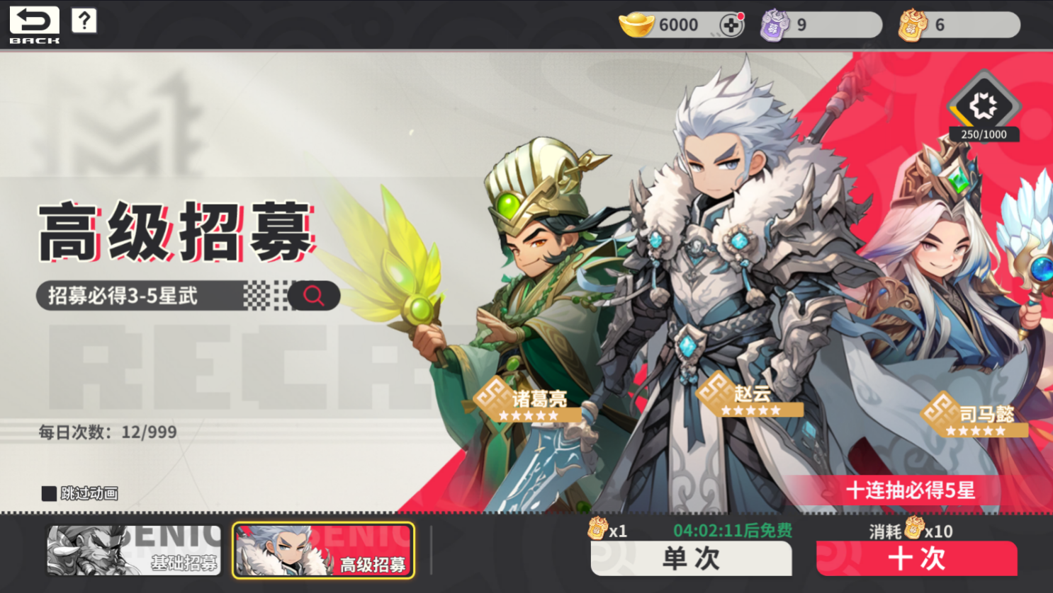 玩家消耗招募令\元宝进行招募,分为高级招募和普通招募,不同招募方式消耗不同道具,每次招募会活动招募积分,积分达到指定数值后可消耗积分直招五星武将,高级招募十连必出一个红将。