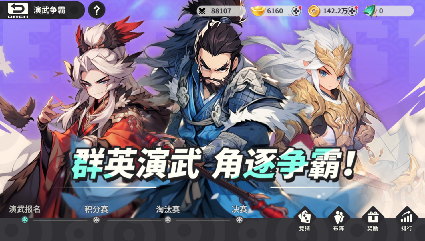 开服3天后开启,每周五至周日进行,玩家通过演武争霸玩法可以获得大量资源,演武争霸分为四个阶段,各阶段设置不同的玩法,玩家可以通过上阵不同英雄来追求最高的荣耀