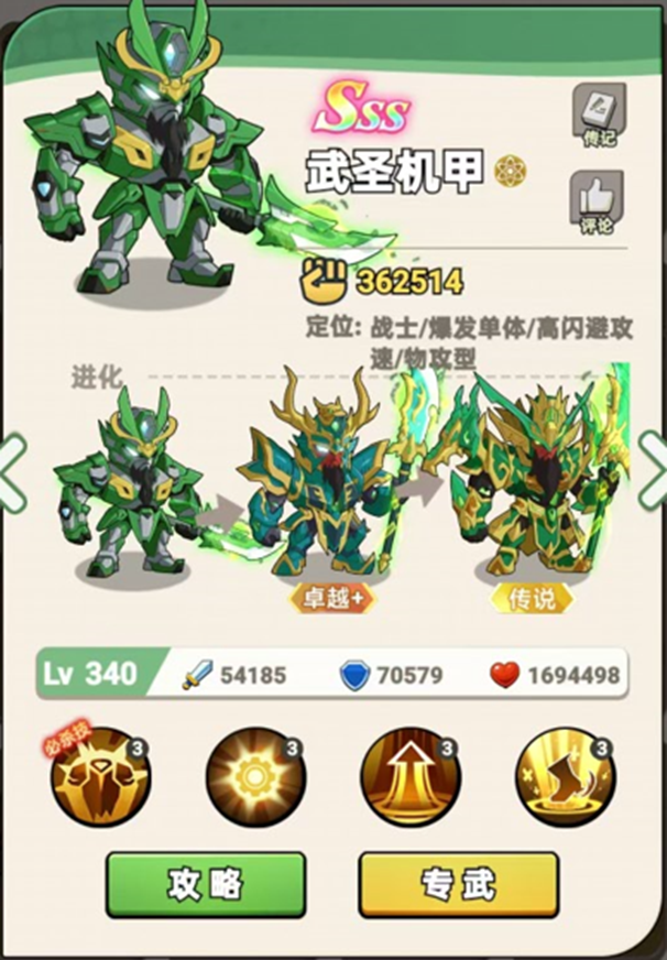 极具深度的养成体系,英雄卡牌分为SSS、SS、S品质,除常见的英雄本体升星系统,还引入了英雄专属武器、神器、装备、符石、饰品、兴趣、天赋、喂养等等一列竖向养成系统,最高5部队养成需求,共计30个英雄。S品质以上的英雄,都具有三种酷炫形态!