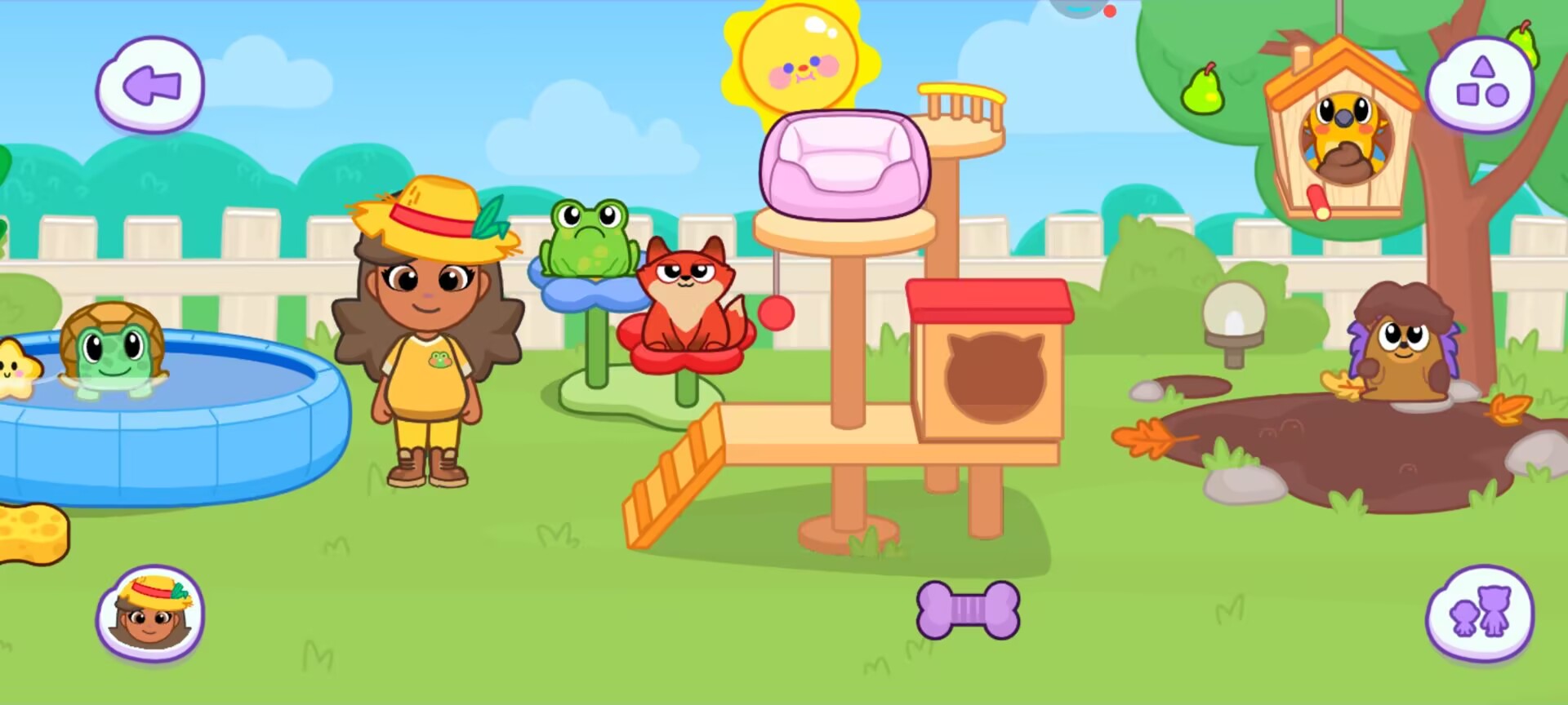 在宠物小院你可以见到各种小动物,胖胖的小松鼠,呆萌的小乌龟,还有小刺猬和猫头鹰。你可以和他们进行互动,点击他们会发出专属叫声。还可以给他们喂食和洗澡,一起爬上宠物架,一起在草地上玩耍。在这里度过一整天的闲暇时光,晚上再将它们送回温暖的小窝。