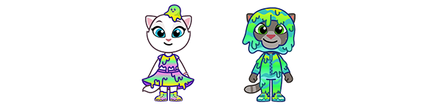 【预约福利专属服饰】史莱姆套装-含汤姆猫史莱姆套装和安吉拉史莱姆套装。每套套装包含上衣一件、下装一件(裤子或裙子)、以及头饰一件。