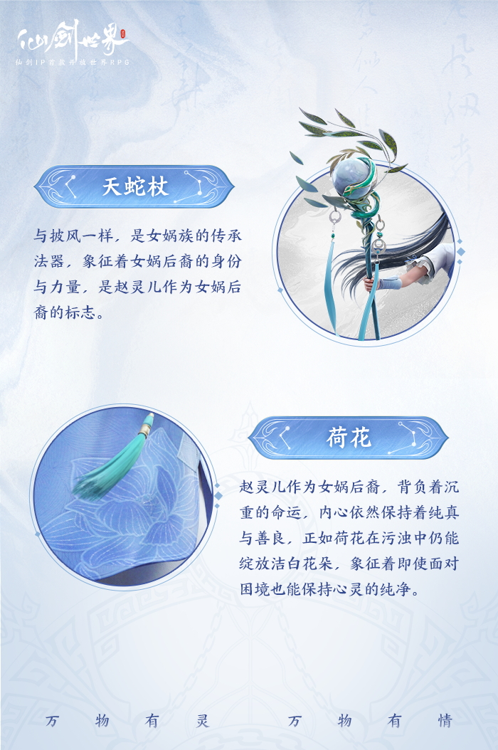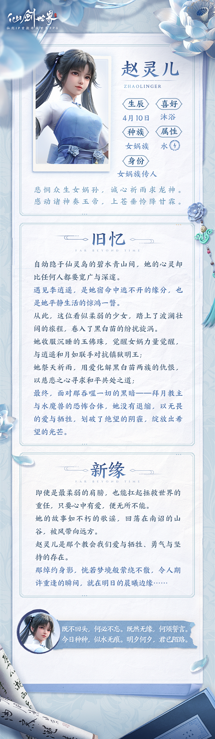 受天命眷顾,女娲族裔与人类共生之女。外表柔弱,内在坚毅的她,原本只是个与世隔绝、宛若池中白莲般的脱俗少女,自幼跟随姥姥隐居仙灵岛修炼,躲避仇人的追杀。直至遇到闯入仙灵岛的李逍遥,便再也躲不过黑白两苗族的冲突纠葛而身陷其中。