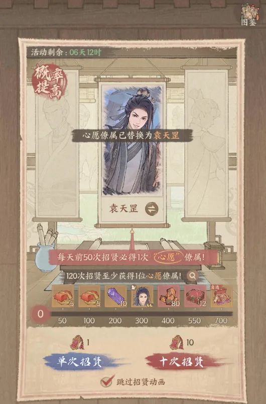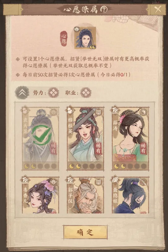 每日前50次招贤必得1次[心愿]僚属,120次招贤至少获得1位[心愿]僚属;