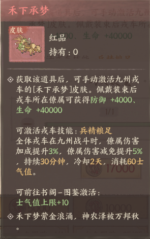 这次车皮的技能还可以,3阶可增加戎车僚属6%的增伤和10%的免伤。