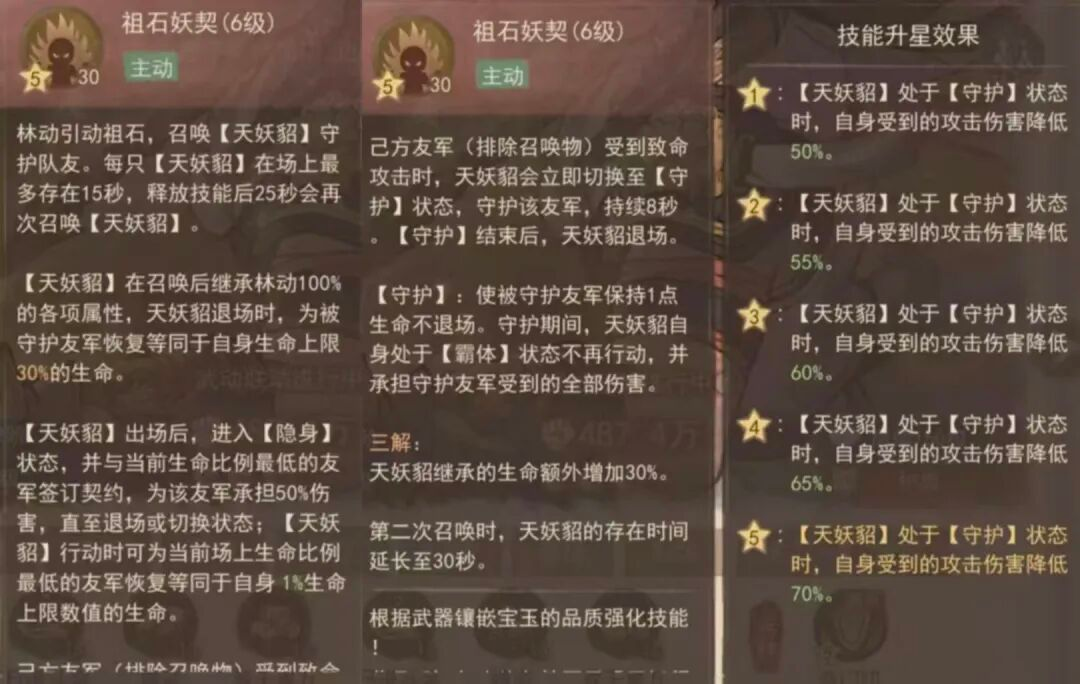 2.守护状态是友军收到致命攻击时切换,持续8s。期间友军保持1点生命不退场,这个意思是也不能回复生命,但是多了8s的作用。很多时候会有起效。然后天妖貂退场时会回复30%。几乎是李一桐的一个小技能了。