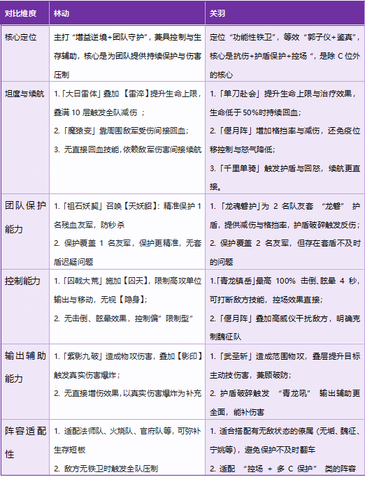 作为《这城有良田》中的热门铁卫,关羽的功能性早已得到验证,而新上线的林动在定位与玩法上与之形成差异化竞争,具体差异如下表所示: