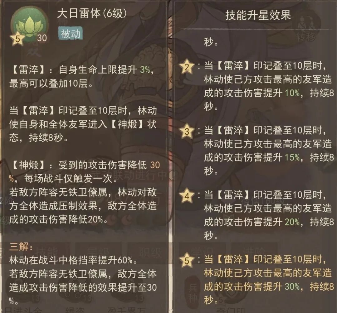 又是一个很全面的技能。首先【雷淬】依靠五人每损失20%生命获得一层,叠层还是挺容易的,可以给林动增加55%的生命上限。