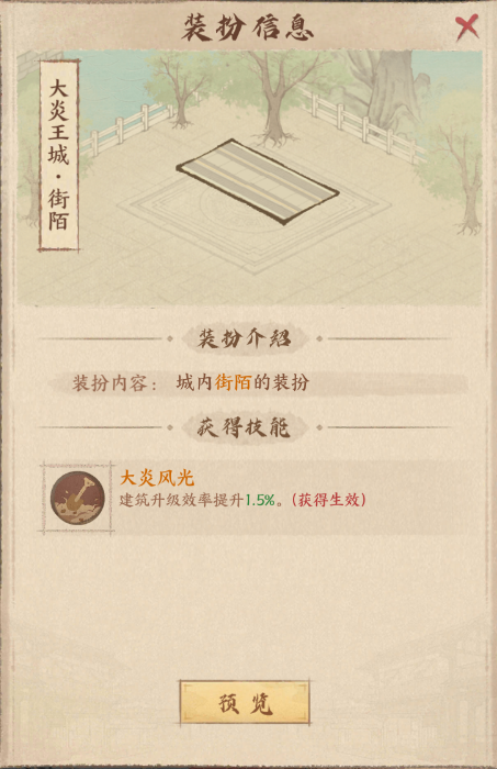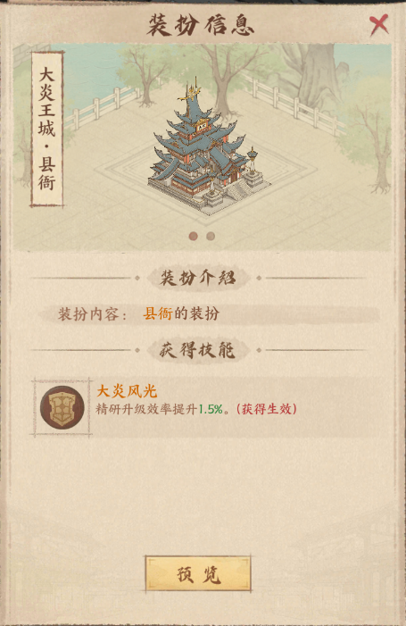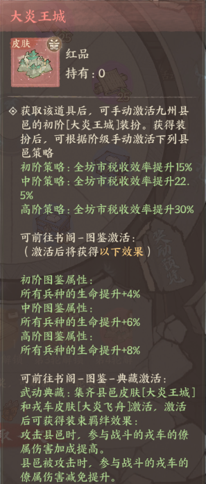 武动典藏:集齐县邑皮肤[大炎王城]和戎车皮肤[大炎飞舟]激活,激活后可获得装束羁绊效果: