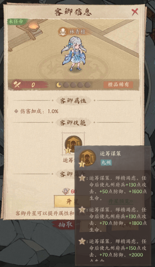 这是第2个橙品稀有客卿,和第一个橙品稀有客卿·李一桐一样,可以升10级,加成比红色客卿还高。