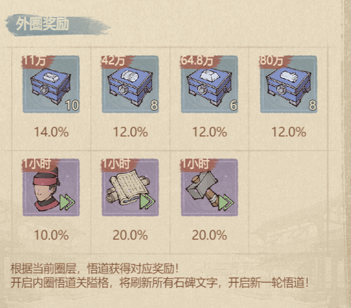 2、若参悟到本圈的“悟道文字”,可直接解锁本圈剩余文字,拿全奖励,并进入下一圈。