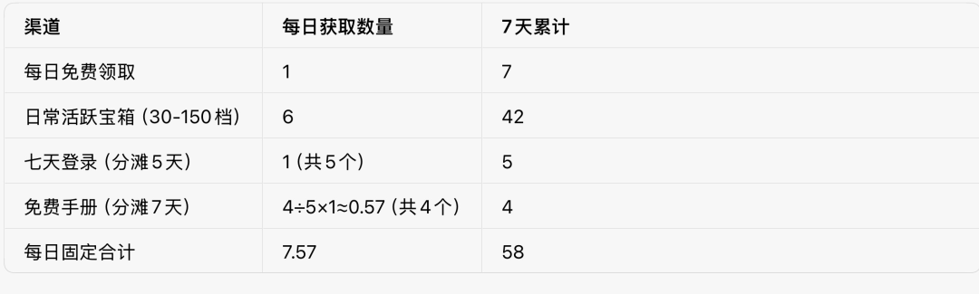 通过每日任务、每日免费礼包、七天登录、免费手册,累计最多可获取58个,具体如图: