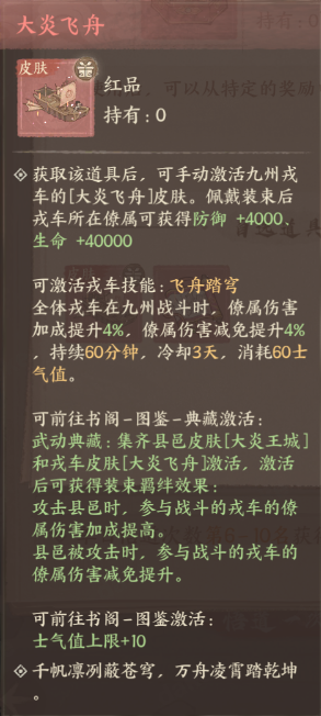 这次的车皮的技能“飞舟踏穹”,在九州战斗时还是蛮有用的,比较适合频繁打架的玩家。高阶情况下,可以让僚属的伤害加成和减免都+8%,持续60分钟,打团直接起飞。
