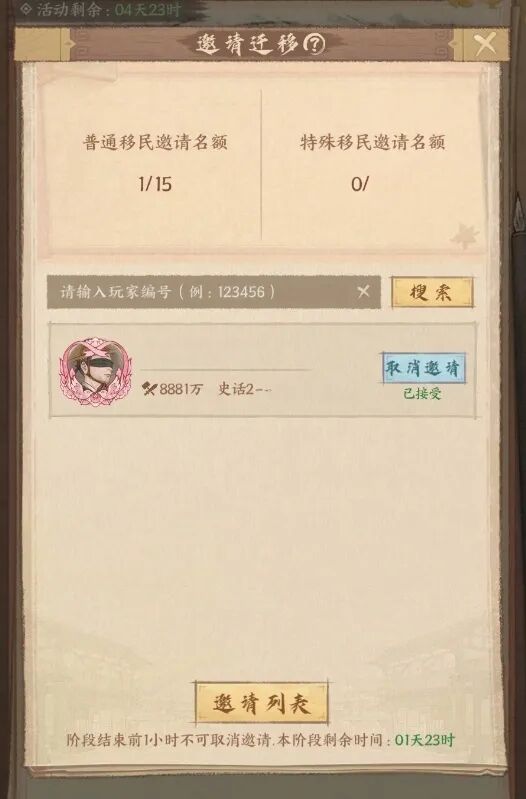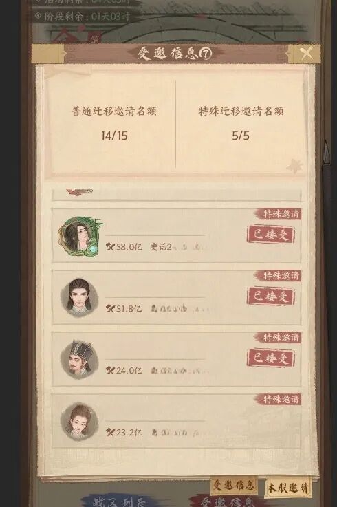 本阶段,战区御史可以设置本战区的迁入实力限制,有迁服意愿的县令可以先联系目标战区的战区御史,御史可以在本活动第二阶段发起迁移邀请。