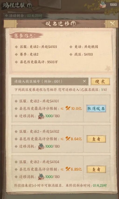 在此期间,所有县令均可在此期间可进行主动报名,输入目标战区编号(例如输入"001"搜索S001),查看迁入条件。申请迁移至意向战区。报名需满足目标战区评分限制,若超出限制,则需竞争极为有限的特殊名额。