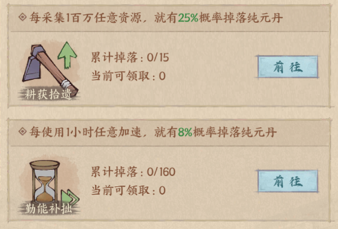 · 通过7日签到、免费礼包、免费手册、古城潜修和百朝历行活动任务,最多能获得356个免费纯元丹。
