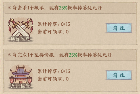 1、25%概率掉落:击杀1个叛军、完成1个望楼情报、采集1百万任意资源(均按单次任务计算),三类任务的累计掉落次数上限均为15次。
