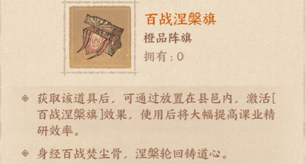 把这个阵旗放置在县邑建筑中,能够有效加快课业的精研速度,能节省大量的课业加速道具。