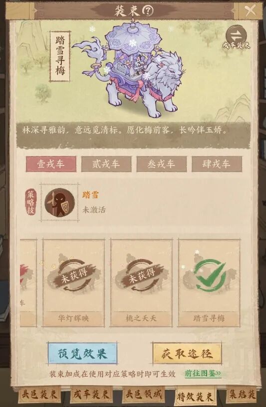 激活此外观,您戎车队伍在九州大地行进时,将触发专属 “踏雪”行军特效:所过之处,细雪纷飞,如携冬意,在身后留下一道淡淡霜迹。每一步落足,皆有冰晶微光泛起,仿佛真正踏雪而行,风雅中透出凛冽气场。