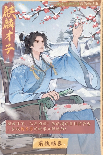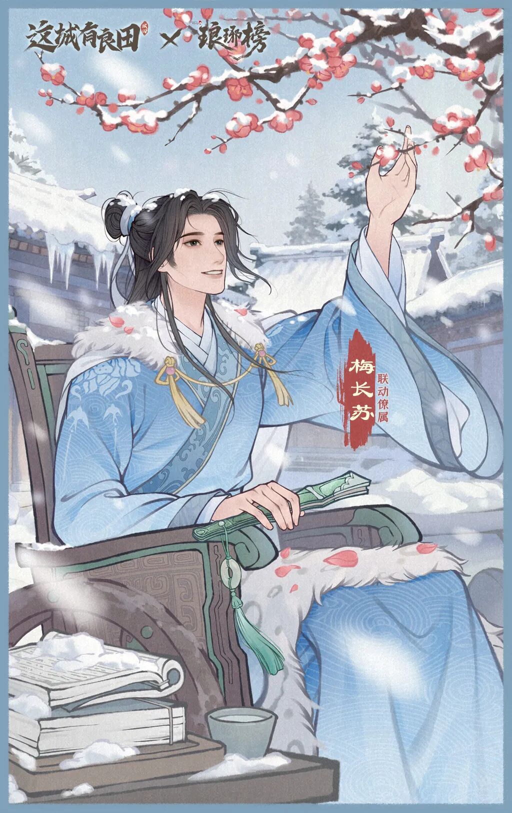 寒梅映雪,折扇轻持。那位身着蓝白古裳、外披毛领披风的清雅身影,正是算无遗策的江左梅郎——梅长苏。他指尖轻触覆雪红梅,眉眼沉静,似在运筹帷幄,又似在静观风雪。