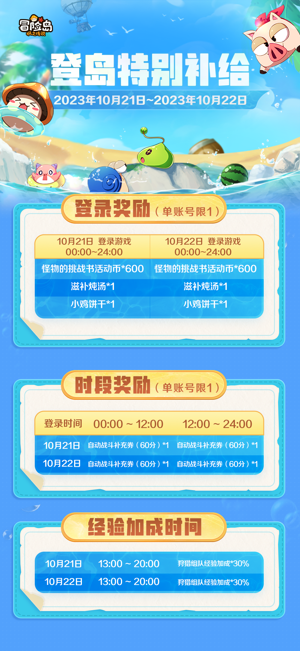 10月22日 00:00~24:00 登录游戏:怪物的挑战书活动币*600,滋补炖汤*1、小鸡饼干*1