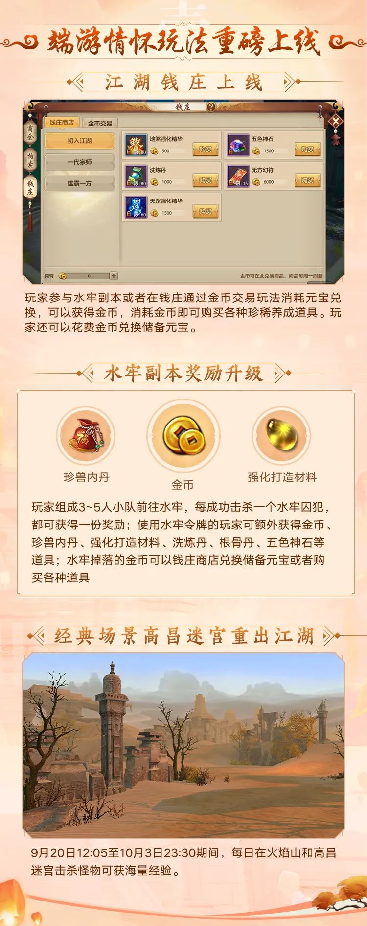月圆中秋,人圆月下。中秋是侠士相聚、举杯同饮的绝佳时刻。而在佳节即将到来之际,为了让江湖更热闹,我们决定搞点大动作——还原端游的钱庄玩法、奖励升级的水牢副本、重出江湖的高昌迷宫,以及各种回馈福利活动,都将随着版本更新到来!下面,大家就跟随老赵的步伐一起来看看吧!