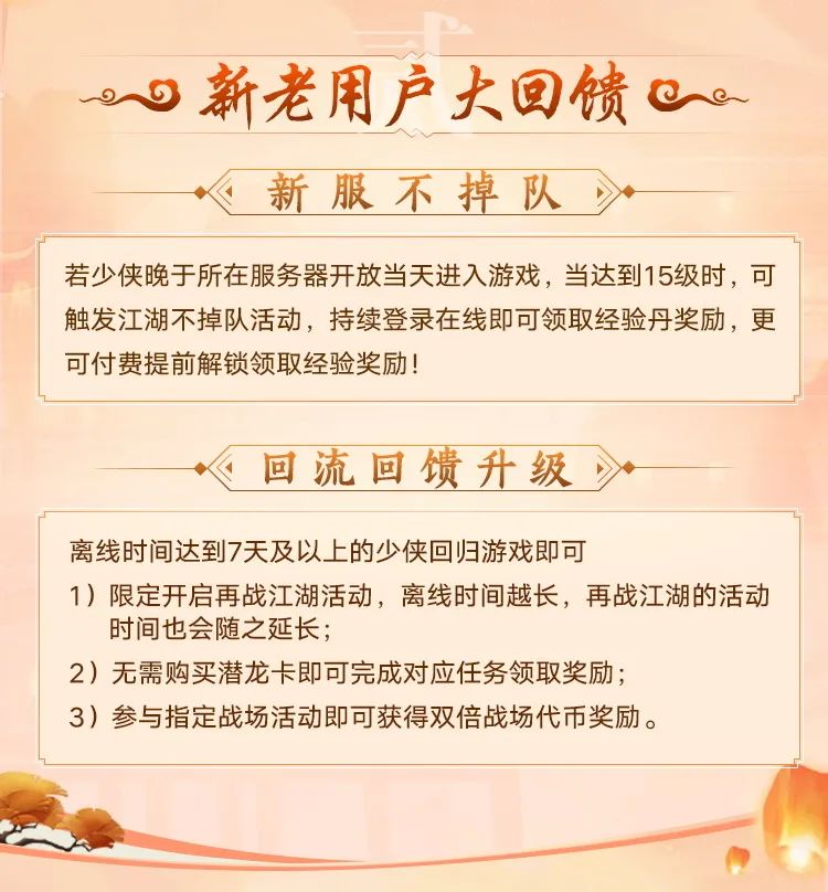 为了感恩少侠们的陪伴与同行,我们准备了丰厚的经验丹奖励,助力少侠在新服加速升级!而离线时间达7天以上的少侠,回归有双倍战场代币奖励,更有再战江湖时间延长、无需购买潜龙卡等特殊礼遇~无论是初次踏入江湖的少侠,还是刚回家的少侠,都可以轻松升级,拿满丰厚好礼!