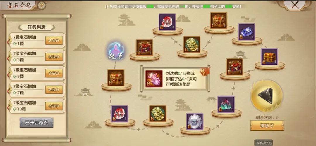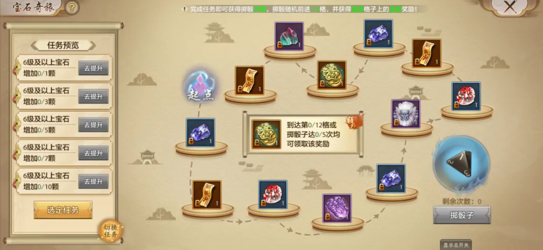 少侠完成选定任务,即可获得掷骰子拿大奖的机会!完成任务即可获得掷骰子的次数,每次掷骰子将随机前进1-4格,少侠可以获得途经格子上的全部奖励。