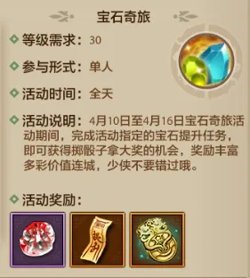 行走江湖,实力为先。宝石等级是战斗力的直观体现之一,少侠可以通过搭配合适的宝石,让自己的战力更上一层楼。从今天开始,宝石奇旅活动开启,少侠不妨根据自己的需求,选择对应的宝石任务,多种稀有道具就在眼前!