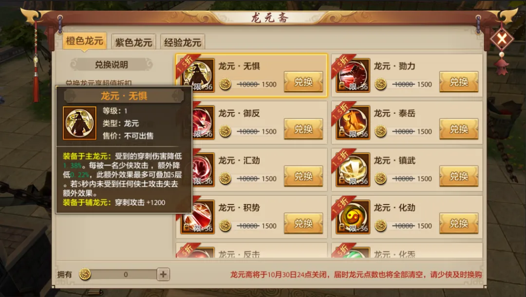 不仅如此,这次少侠们可以享受超值特惠!第一次兑换享受1.5折优惠,第二次兑换享受3折优惠,三次及以后兑换时享受9折优惠,所有紫色龙元、橙色龙元分别共享兑换次数!