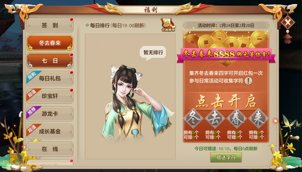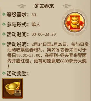 在2月24日-2月28日期间,等级不低于30级的少侠,参与日常活动收集迎春赠礼。少侠只要集齐“冬去春来”字符,即可于每日19:00-21:00,在福利-冬去春来界面内开启红包。开启红包时可获得随机额度的绑元奖励,最高有机会获得8888绑元大奖哦!