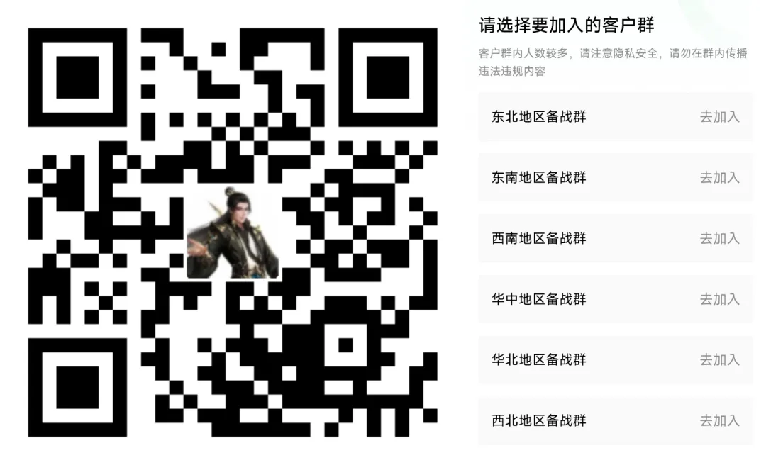 为了让少侠们提前寻找志同道合的队友并肩作战,天龙准备了各地专属备战群。无论少侠身处何处,只需扫描下方二维码,选择对应地区的群组加入,就能迅速结识来自同一地域的战友,群里直接约战术,开服直接干票大的!
