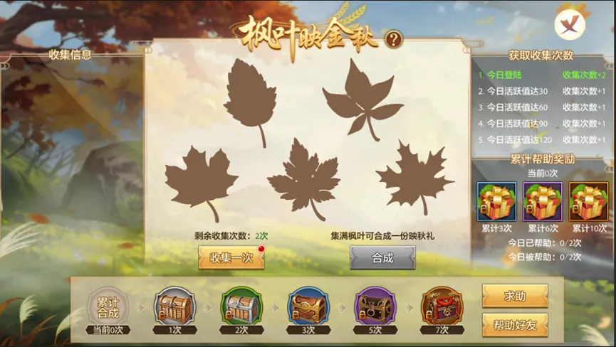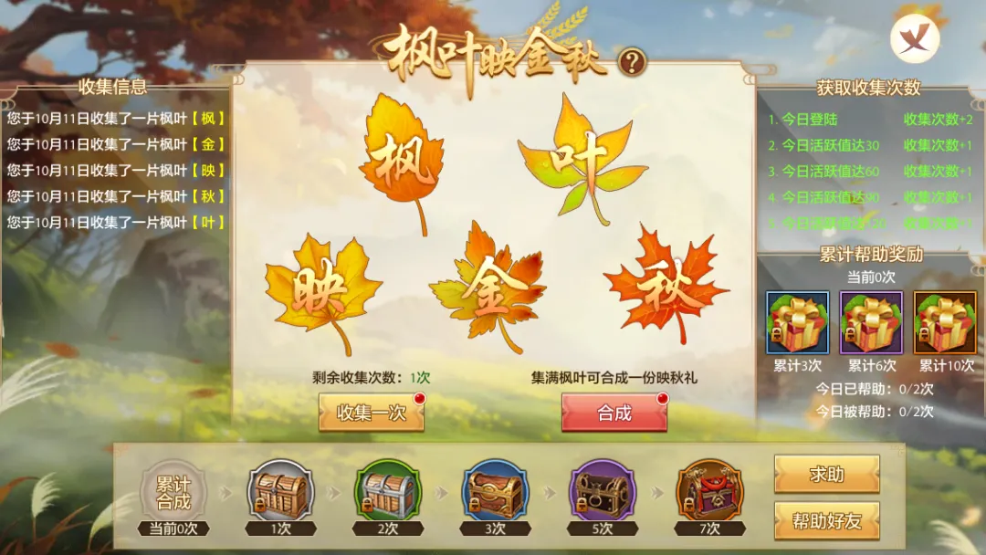 霜叶知秋,枫叶如火,如此盛景岂能错过?老赵在此诚心相邀,请少侠共赴一场充满诗意与温情的秋日收集。在10月11日-10月17日期间,少侠可以收集、合成枫叶获得奖励。