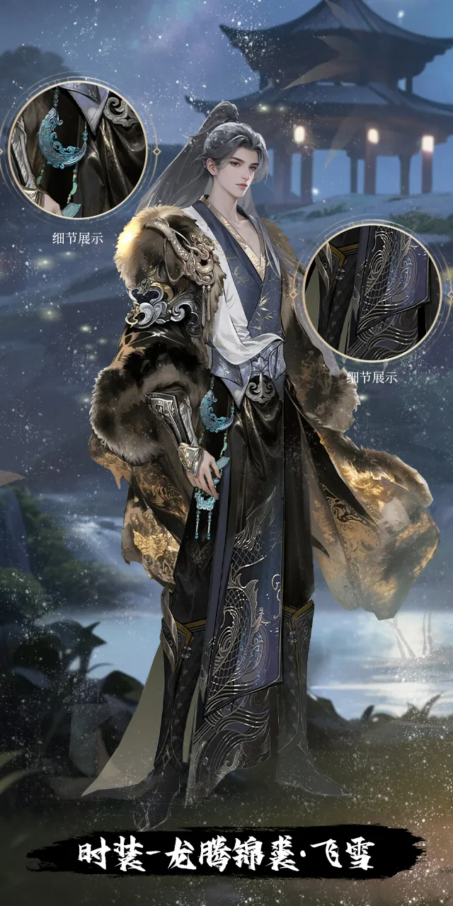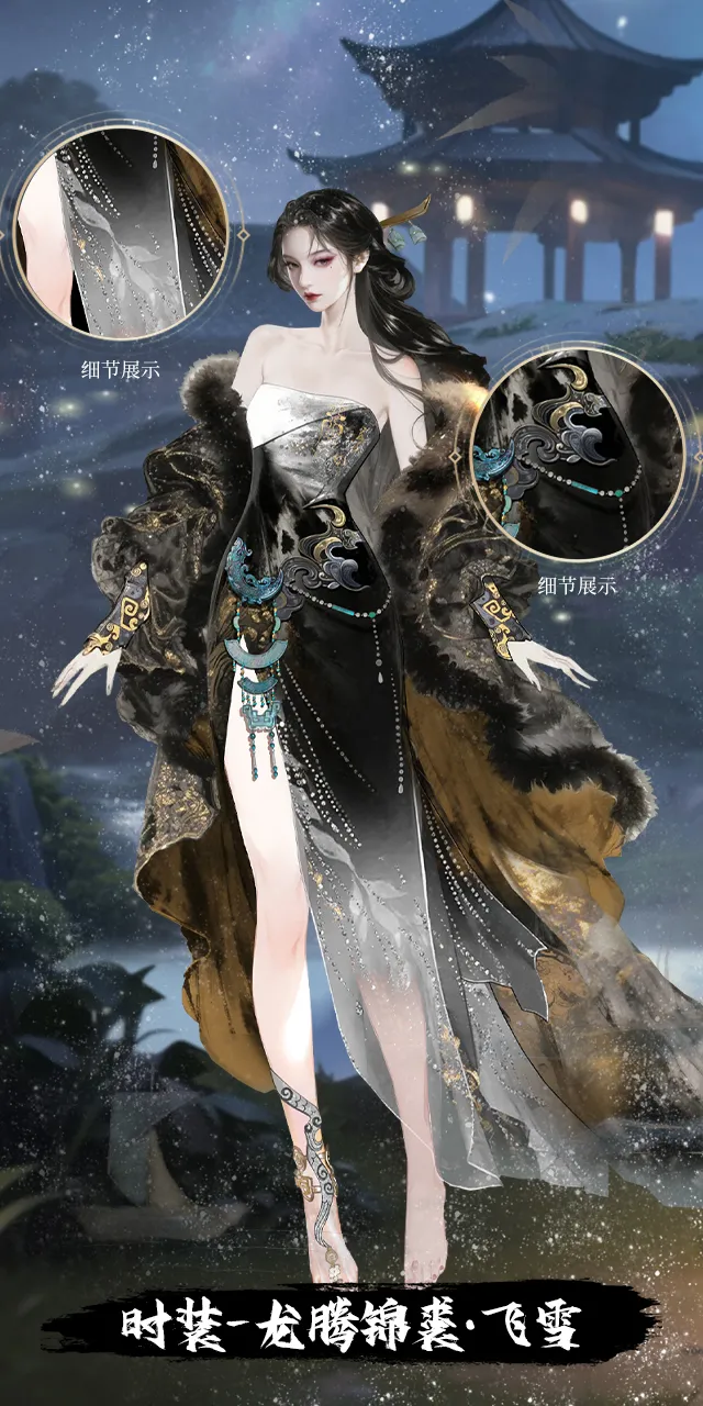 黑金交织间尽显庄严华彩,毛绒质感既有抵御霜风的温润质感,又添几分贵气凛然;龙纹刺绣栩栩如生,金线勾勒处暗藏锋芒;