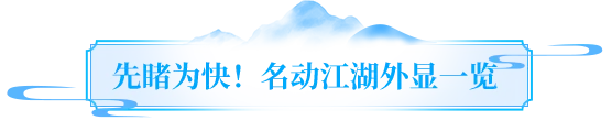 除了上述自带江湖气韵的全新外显,本次名动江湖更将诸多少侠梦寐以求的经典外显悉数召回——绝世装备重楼盔、重楼玉,曾经梦寐以求的往期外显就在眼前,这圆梦时刻,少侠岂能错过!
