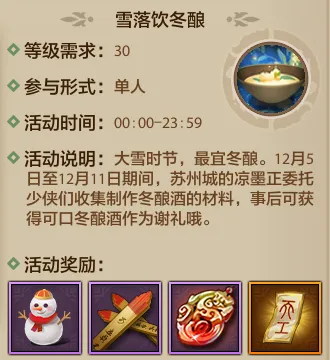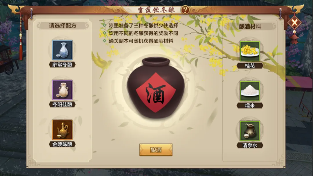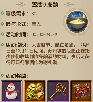 大雪时节,最宜冬酿。苏州城内岁暮天寒,檐角覆雪,炉火初红,正是围炉温酒、喜迎深冬之际。凉墨已备好酒坛,正托少侠们帮忙收集酿制冬酒的材料,桂花、糯米、清泉水。