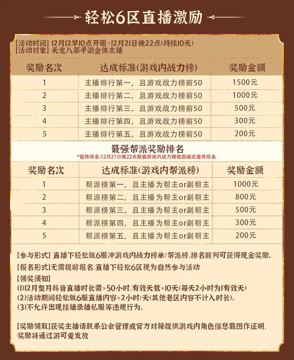 只要你是一名《天龙八部手游》主播,12月12日10:00—12月21日22:00(共10天)期间,在抖音直播轻松版6服【横扫六合】,即视为自动参与。