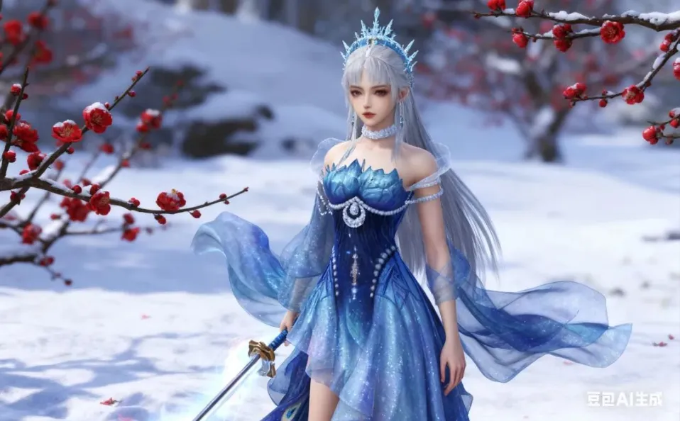 少侠的作品,一人,一剑,于红梅映雪的静谧天地间执剑漫步。簌簌落雪悄然点缀剑锋与肩头,点点梅红在素白世界里灼灼绽放。