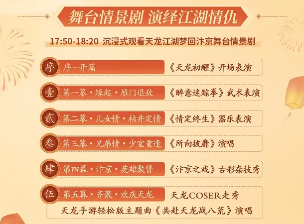 17:50,舞台情景剧将准时开演,一曲江湖梦、一折汴京情,带你线上沉浸式坠入天龙江湖的千年回响,共赴一场“梦回汴京”的侠意篇章,亲历江湖儿女的恩怨情仇。