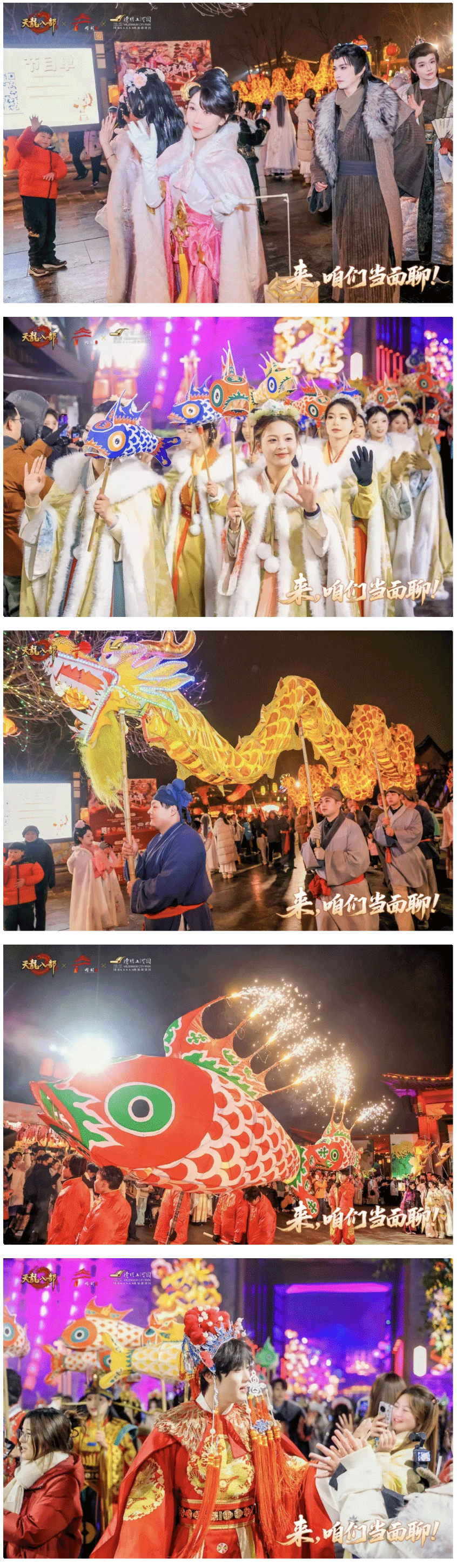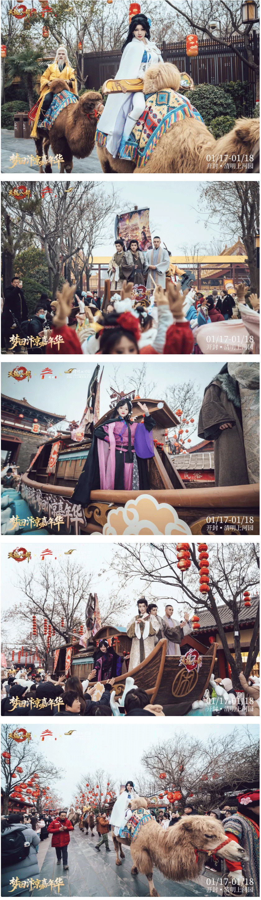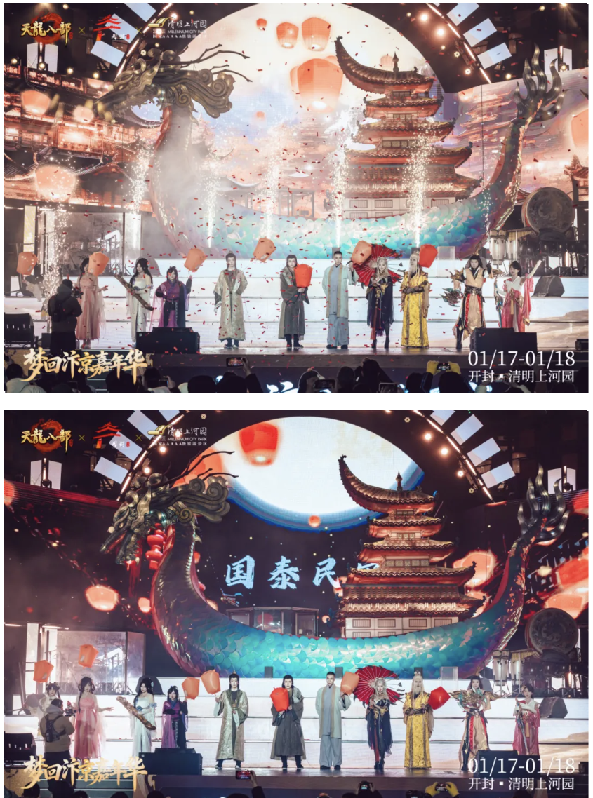 巡游队伍蜿蜒穿行于清明上河园,天龙coser与景区NPC一路前行,向两旁簇拥的少侠们挥手致意,笑语欢声,宛如故友重逢。
