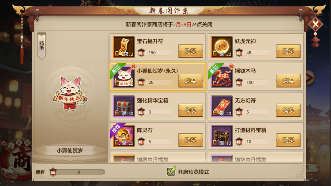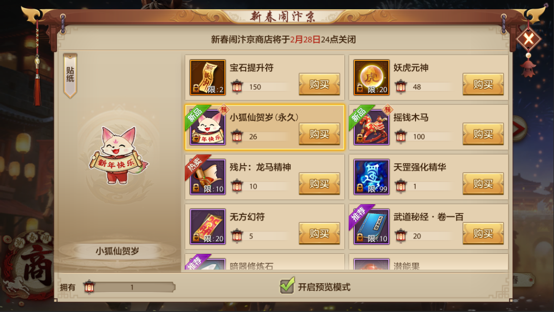 与此同时,轻松版主题商店也将焕新为「新春闹汴京」主题商店,少侠们可使用【汴京彩灯】前往主题商店兑换心仪好物:宝石提升符、妖虎元神、小狐仙贺岁(永久)、摇摇马、残片·灵驹雪雕、残片·龙马精神、强化精华宝箱、高级宝石转换券、龙元珀等精美好物。